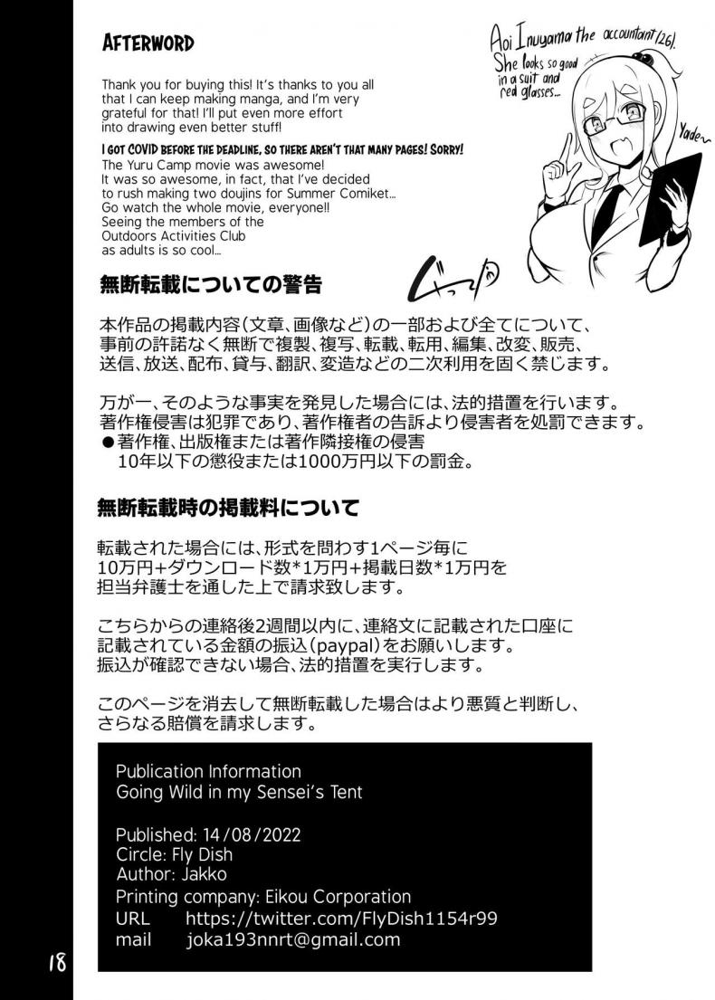 ข้างในเต็นท์ของคุณครู [Fly Dish (Jakko)] Boku to Sensei to Mure Tent Going Wild in my Sensei's Tent (Yuru Camp)